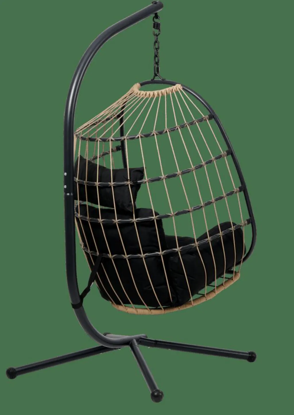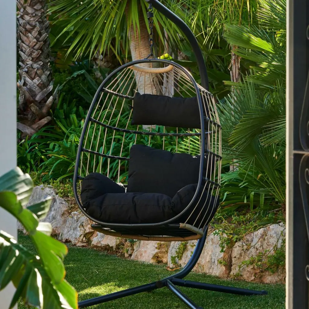 - Structure acier, Laque en poudre noir, 1,8mm diamètre, Corde, naturel, 6mm diamètre, Coussin, Polyester filé, noir